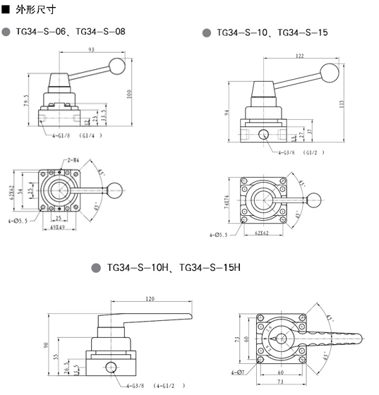 | TG34-S-06 | 三位四通 | G1/8 | 6 | 空气 | 0~1.0MPa | 手动式 | 不需要 | -5~60℃ |