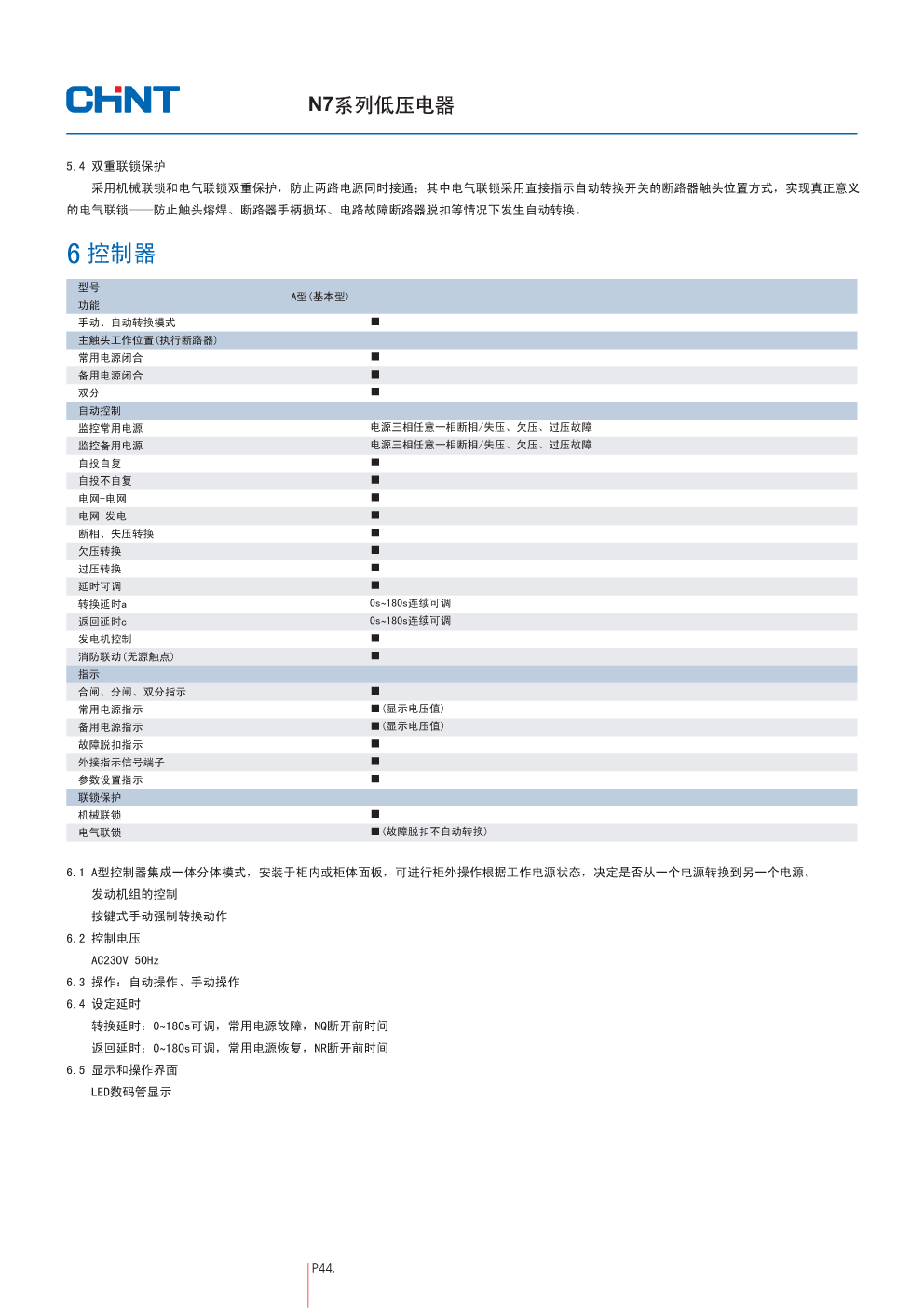 NZ7系列自动转换开关电器适用于交流工频50Hz,额定工作电压AC400V,额定工作电流至630A的三相四线双路供电电网中,自动将一个或几个负载电路从一个电源接至另一个电源,以保证负载电路的正常供电。本产品适用于工业、商业、高层和民用住宅等较为重要的场所。执行标准:GB/T 14048.11。